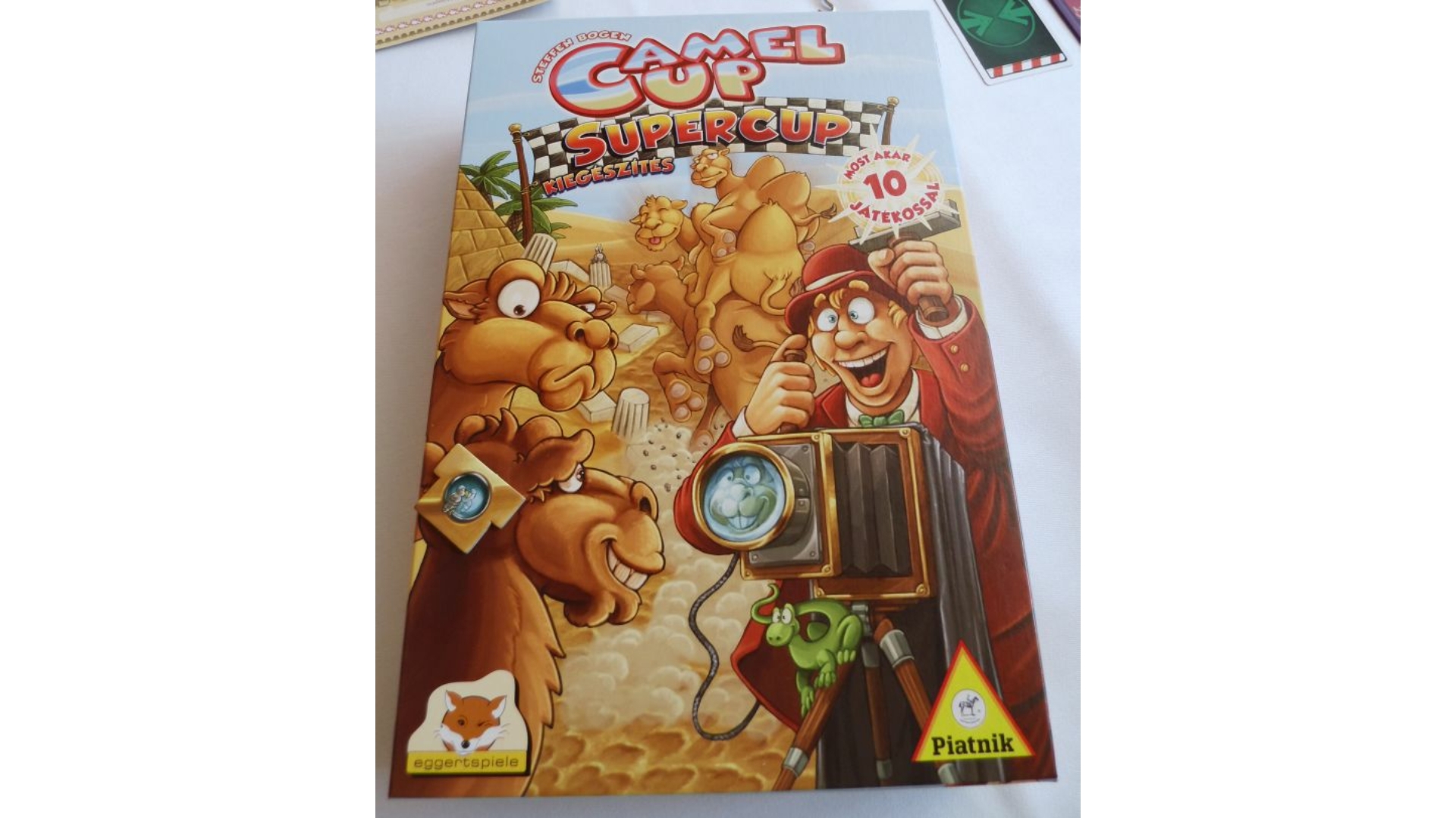 Nagyon jó kiegészítője az alapjátéknak. 4 modult vezet be, amelyek közül tetszés szerint lehet beválogatni az alapjátékba. Az első hogy egy kamerát lehet elhelyezni egy adott mezőre, és a játékos annyi fontot kap amennyi teve rálép. A kamerának a hátránya a sivatag lapkával szemben, hogy bár több pénzt fizet, de a kamerát egyből vissza kell tenni rálépés után, nem lehet ott a szakasz végéig. A második modul a kedvencem, amivel nem csak az első két helyezettre, hanem bármelyikre lehet fogadni. A harmadik modulban minden tevéhez jár egy plusz segédkocka, minden szakasz elején a legutolsó teve segédkockája bekerül a piramisba, így össze tudja magát szedni :) . Egy kocka dobásért járó lapkáért pedig egy segédkocka beledobható a piramisba. Utolsó modult még nem próbáltam ki, ott "fogadási szövetséget" lehet kötni egy másik játékossal, nem tűnt annyira meggyőzőnek. A játékhoz jár egy kisebb tábla, amit attól függően többféleképpen csatolhatunk az alapjáték táblájához, hogy mely modulokat használjuk pluszban a játékunkhoz. A kivitelezés itt is nagyon profi az alapjátéknak megfelelően. A játék immár 10 fővel is játszató , és a pálya mérete is megnövelhető. Én nagyon ajánlom az alapjátékhoz