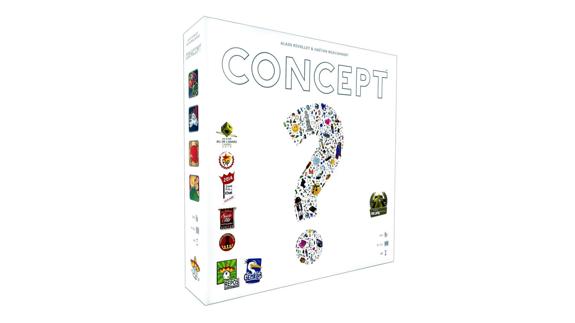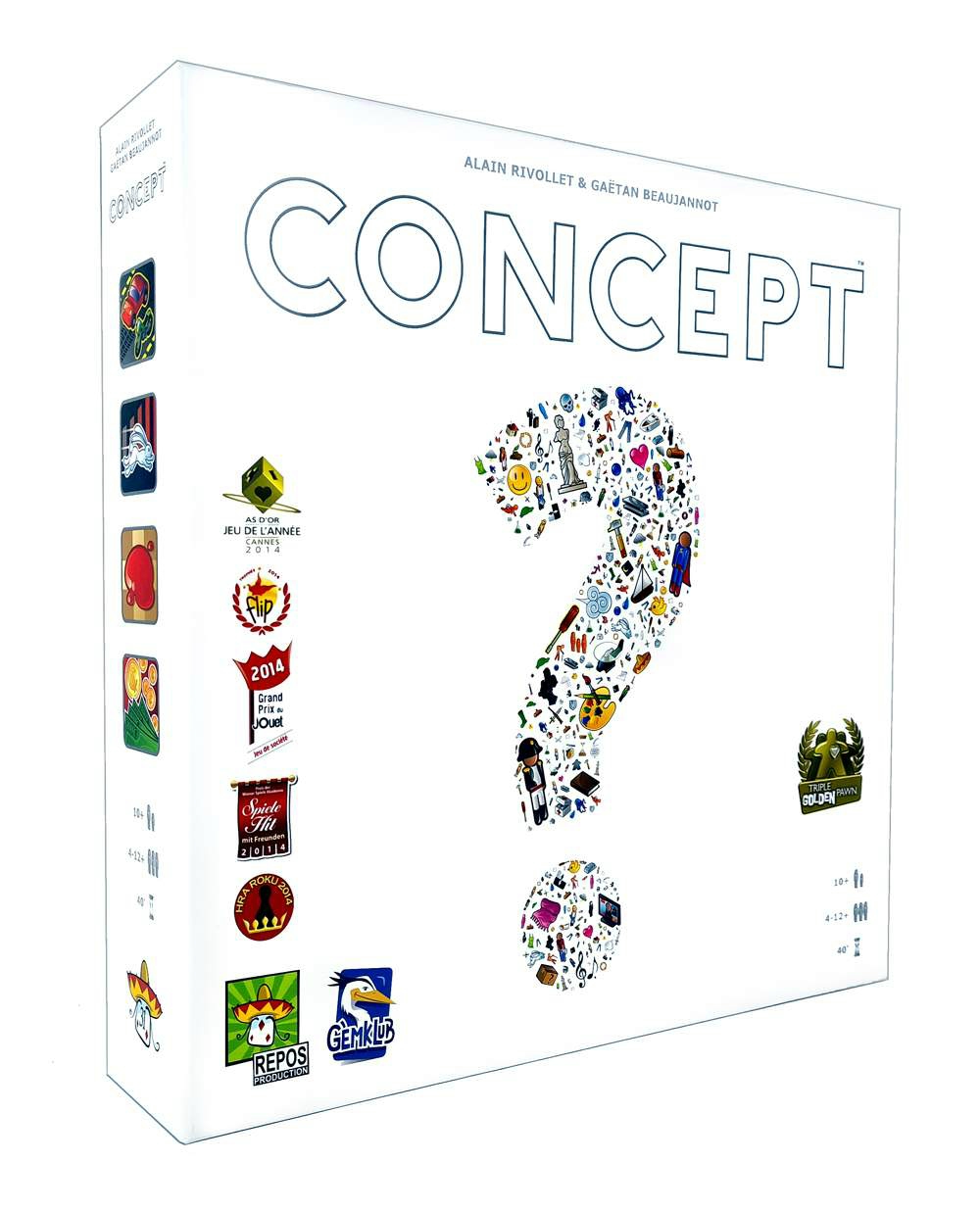 A Concept egyszerű szabályú, Év játéka díjra jelölt családi partijáték nagyobb társaságoknak is. A táblán kis képecskék jelenítenek meg tulajdonságokat: színeket, formákat, méreteket, témákat. A soron lévő játékosnak választania kell egy feladványt, és addig kell elhelyeznie kis jelzőket a megfelelő tulajdonságokhoz, míg valaki ki nem találja. A kreativitást és az összefüggések felismerését fejlesztő társasjáték.