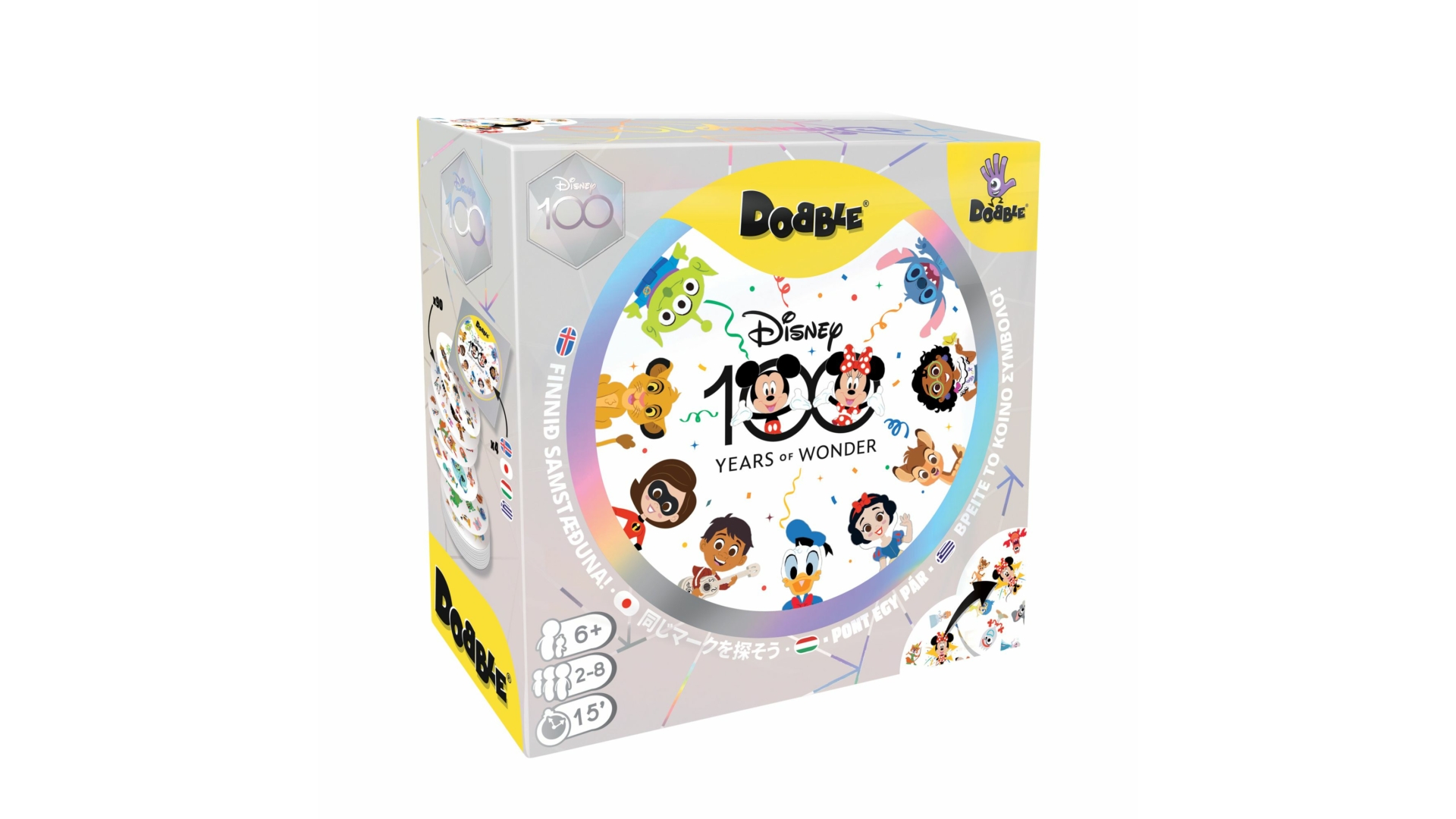 A Dobble Disney 100 pörgős, zsebre vágható kártyajáték 5-féle játékváltozattal. A megszokottnál nagyobb kártyákon 10-10 különböző képecske látható, és bármelyik két kártyán mindig van egy ugyanolyan belőlük. A játékosok feladata, hogy a többieknél gyorsabban megtalálják a közös képeket. A koncentrációt és a reflexeket fejlesztő társasjáték.