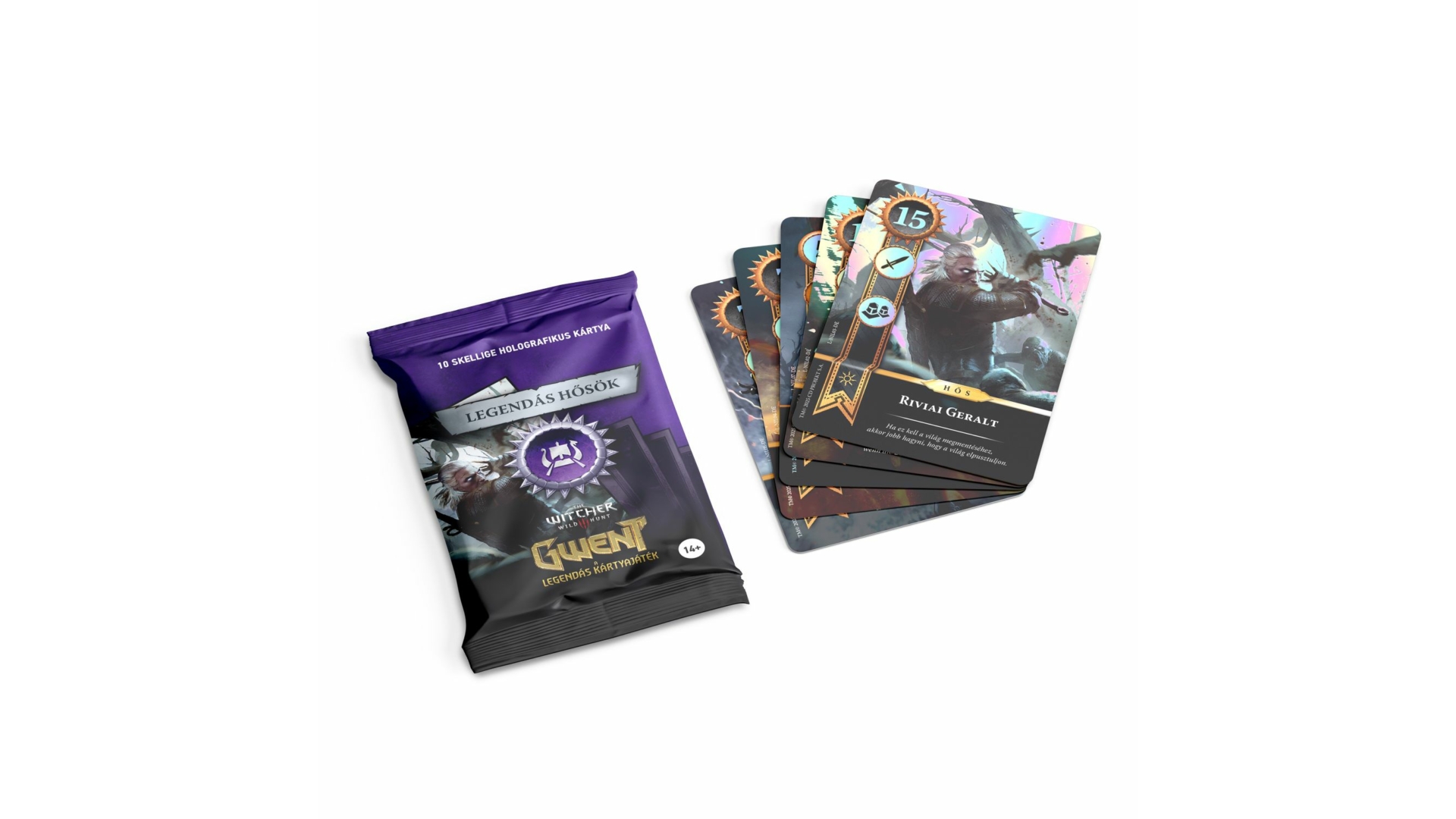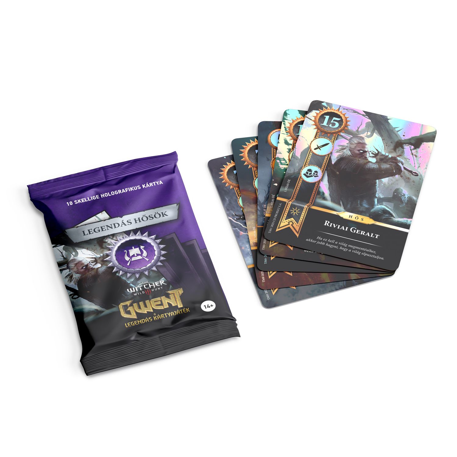 10 db alternatív megjelenésű holografikus hőskártya, amelyekkel lecserélheted a Skellige pakli egyszerű hőskártyáit
