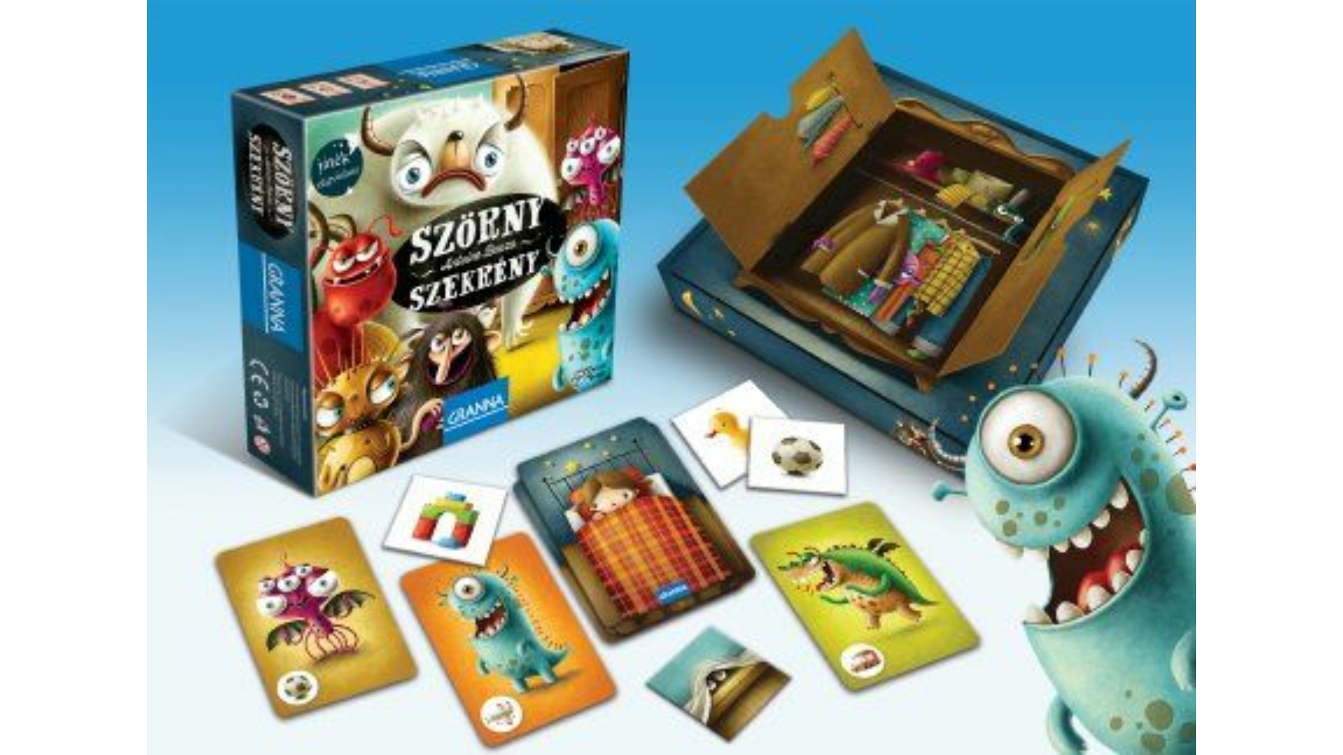 Kergesd be a szörnyeket a szekrénybe! A Szörnyszekrény együttműködős családi társasjáték a legkisebbeknek. A játékosok a memóriájuk segítségével találják meg a szörnyecskéket elűző játékokat.