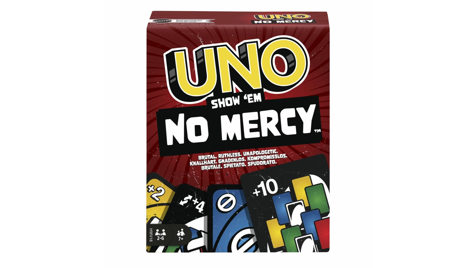 Az UNO 'nincs kegyelem' az eddigi legbrutálisabb UNO változat! Sokkal több kártya van benne, sokkal keményebb büntetéssel, mint valaha - húzz 10 lapot... - kegyetlen. Az új szabályokkal, amelyeknek köszönhetően a játékosok több lapot halmozhatnak fel, cserélhetnek és húzhatnak biztosan hatalmas csaták és vidámság alakul ki, és még egy irgalomszabály is létezik, - igen, ironikus - ha a dolgok túlságosan eldurvulnak.A klasszikus játék ezen kíméletlen változatában kétféleképpen lehet nyerni: megszabadulsz az összes kártyától VAGY kiütöd a többi játékost, így csak te maradsz! Ó – és ha már csak egy kártya marad, kiáltsd: "UNO!"